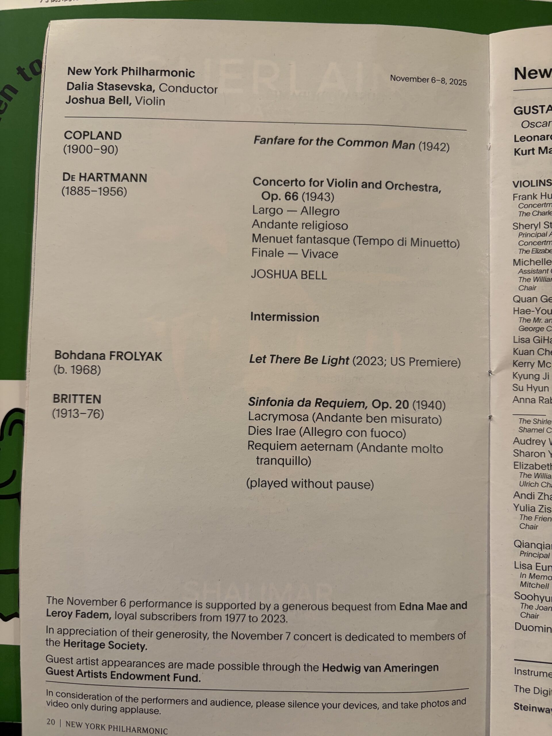 ウクライナの作曲家 ボンダーナ・フロリャクの作品も演奏されました。ご本人も会場に。4曲中、3曲が現代曲だったんですよね。私が若い頃は、東京のコンサートなんて、メンデルスゾーンか、ベートーベンか、チャイコフスキーか、シベリウスのコンチェルトをやっていれば、盛会みたいな感じのコンサート多かったですが、時代も変わったし、なにしろここはニューヨークです。現代曲ばかりでも、観客は大喜びだし、満員御礼。そういうところに、とても感動しました。人がいいと言ってるものを聴くのではなくて、どんな曲だろう?と思って探しに来てるのが、流石だなと思いました。