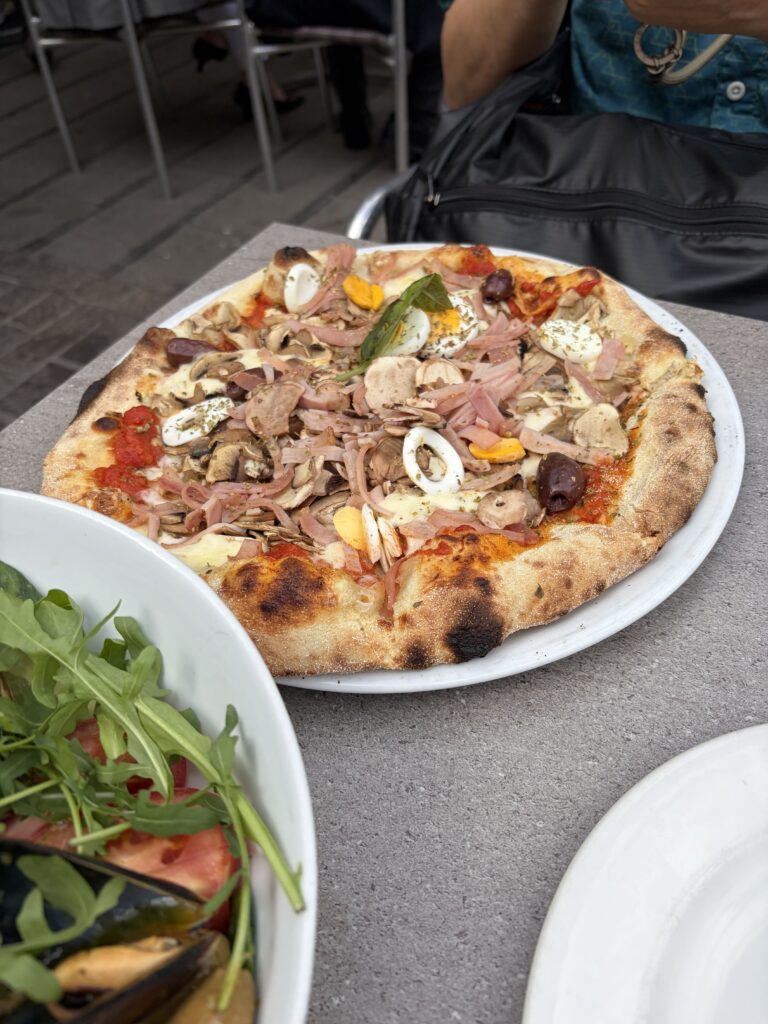 観光地のピザの値段を比べて、入るところを決めようと思っていたら、みんな同じ価格でした。カジュアルなところは、こんな感じで量が多く、ちょっといいレストランは、少なくて材料の質をよくしているような印象でした。ここは、量が多くて、夜ご飯用に持って帰りました。でも、全然問題なく美味しいですよ。