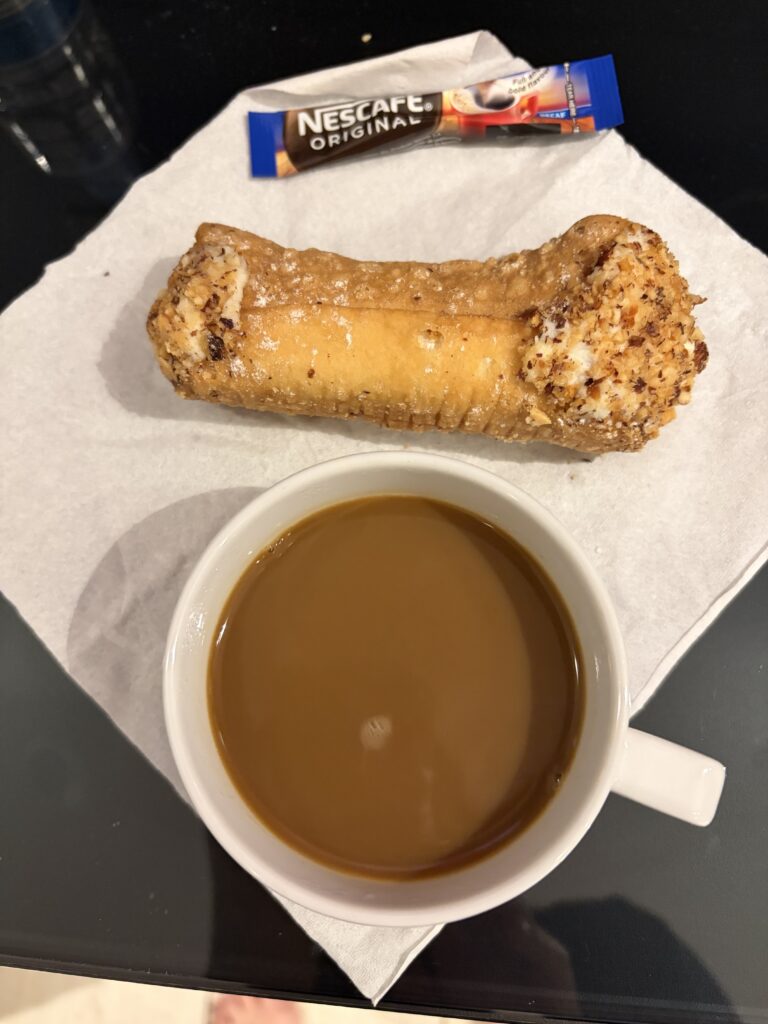 毎日通ったパンやさんで、夫が「カンノーリありますって書いてあるよ!」と目ざとく見つけてくれて、注文して持ち帰り。その場で、クリームをこれでもかってくらい、詰めてくれます。生クリームではないので、冷蔵庫に入れなくても大丈夫だそうです。入れないと、柔らかくなるので気をつけてとのことでした。